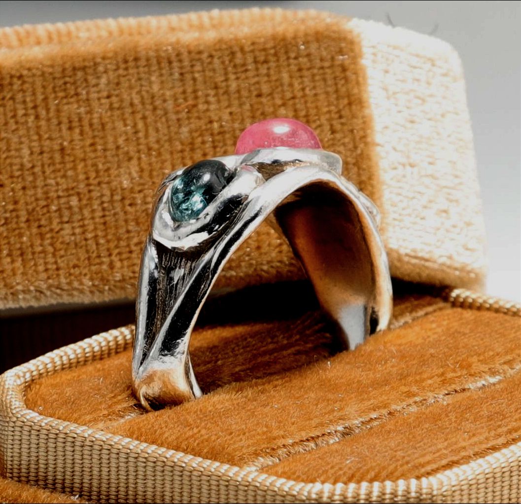 Ringen fremstilles i 925 sterlingsølv eller 18K guldforgyldt sølv med tre ædelsten i en skulpturel, håndformet struktur, hvor lagdeling og organisk form giver hver ring et unikt og markant udtryk.