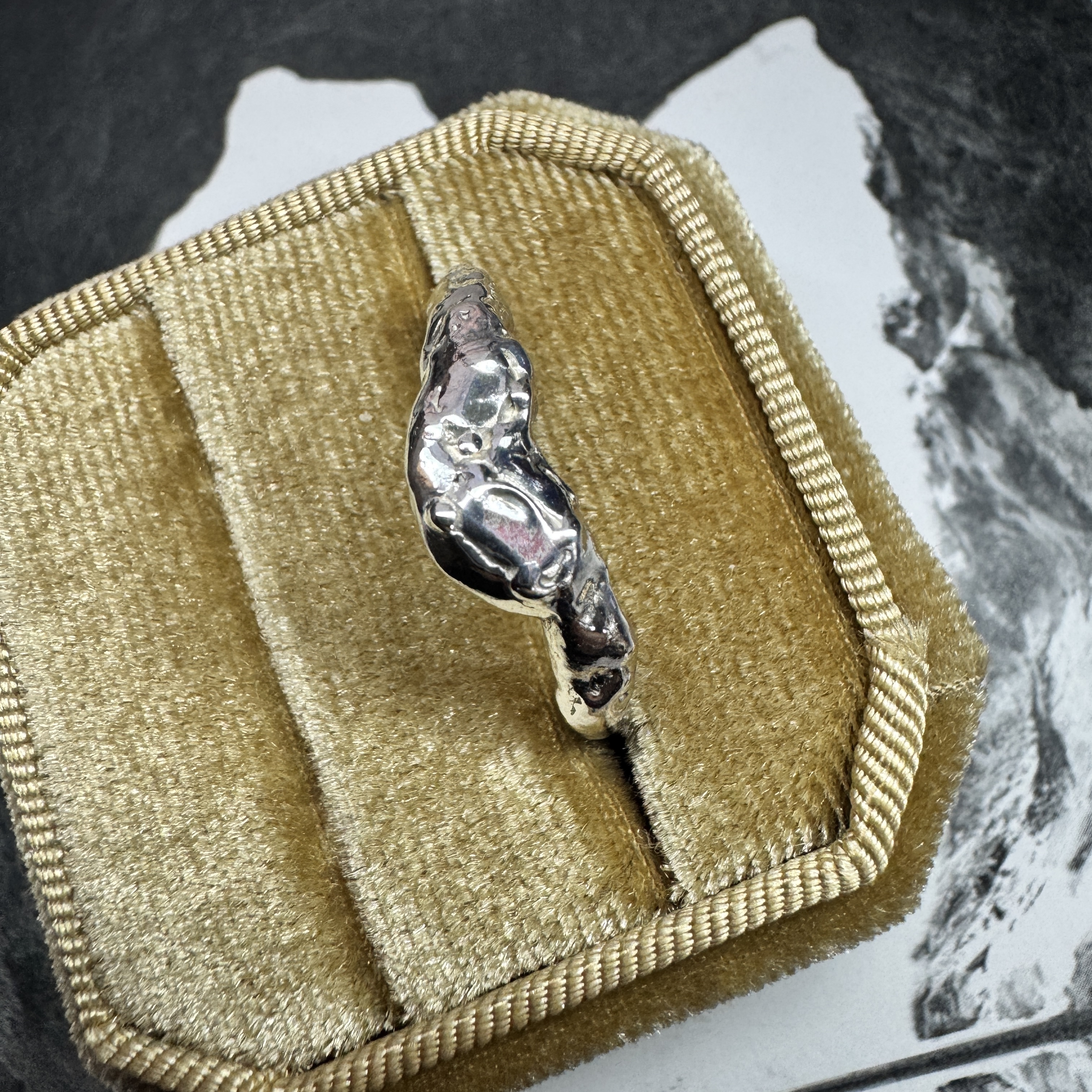 The Sculpted Alchemy Series III er den mest expressive og dynamiske i serien. Den har en mere dybt bearbejdet overflade, hvor metallet formes lagvis for at opnå et næsten geologisk udtryk med små højder, fordybninger og bølgende formationer. Ringen fremstilles i 925 sterlingsølv eller 18K guldforgyldt sølv, og hver enkelt variant vil altid være lidt forskellig, da den håndbyggede proces efterlader unikke spor. Designet er skabt til dem, der ønsker et markant statement men stadig i et naturligt og organisk formsprog.