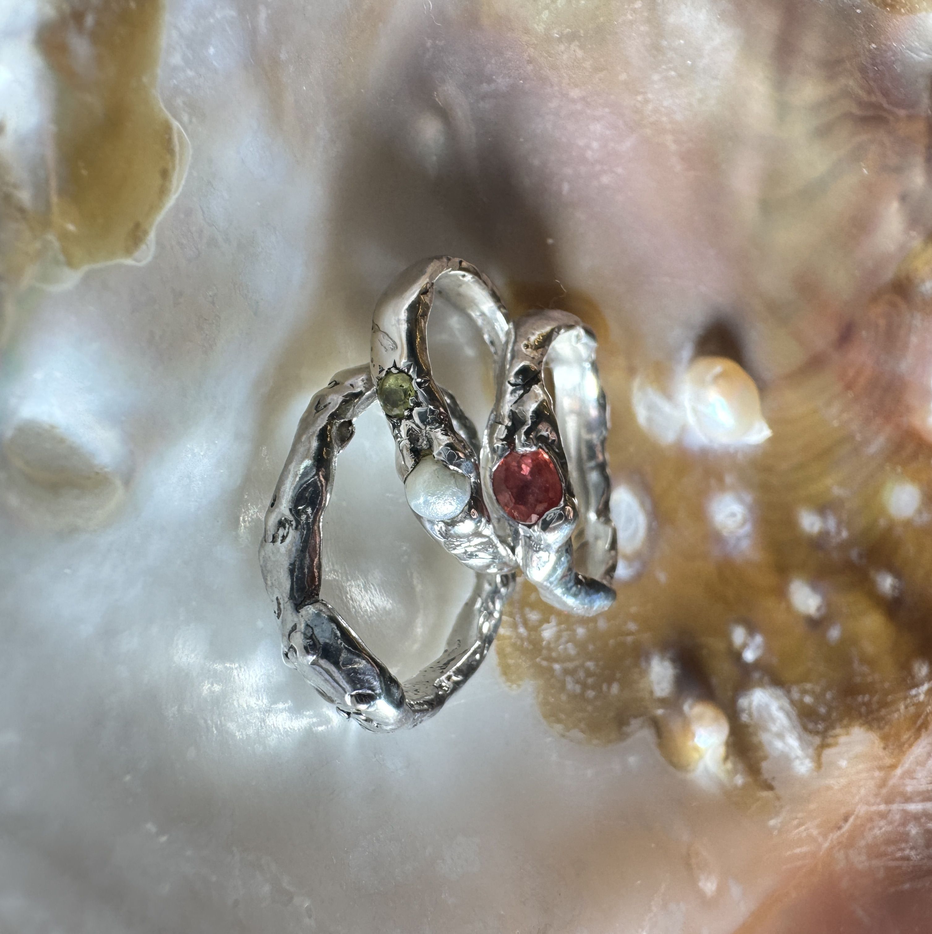 Ringen laves i 925 sterlingsølv eller 18K guldforgyldt sølv med en enkelt ædelsten og en rå, organisk håndformet struktur, og hver ring får sit eget unikke udtryk gennem naturlige variationer i fremstillingen.